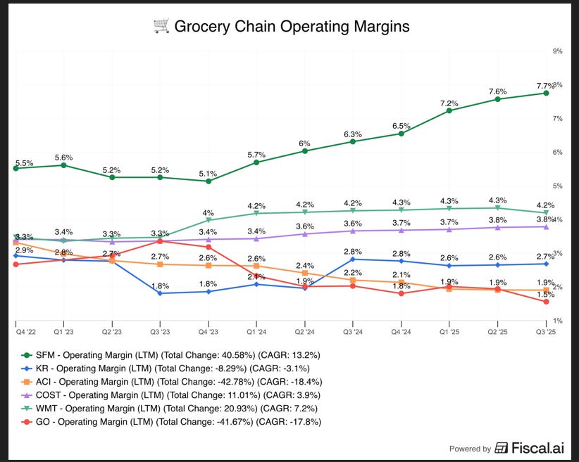 Grocers famously operate on razor thin operating margins; ~3% is kind of the rule of thumb in my head, but that’s just a guideline / not a firm rule. Still, as this chart shows, it holds pretty well across grocers: