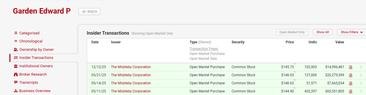 I’d also note a pretty big buy over at MIDD, where Edward Garden (a director / >5% owner) bought ~$15m of stock on the open market (alongside another director buying ~$100k). That $15m buy is a big buy in itself…. but it brings Mr. Garden’s purchases on the year to ~$100m. Garden has an impressive financial background; he also serves on several boards and does not resort to open market purchases much. Combined, I’d suggest there’s likely to be some signal in those buys.