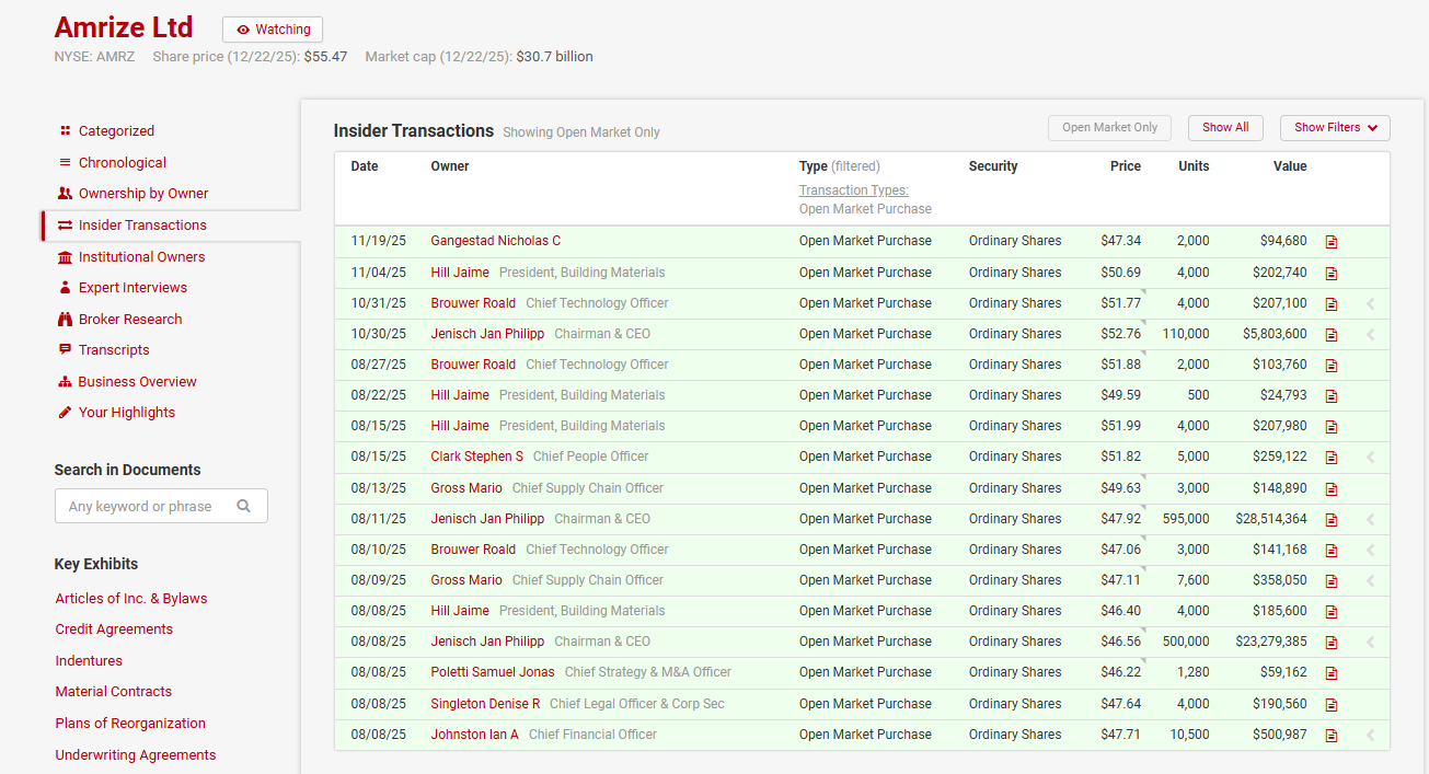 But perhaps the most interesting buy is at Amrize (AMRZ). AMRZ is a cement and aggregates company that spun off over the summer. Insiders have been massive buyers since the spin, with across the board buying headlined by ~$60m in purchases from the CEO.