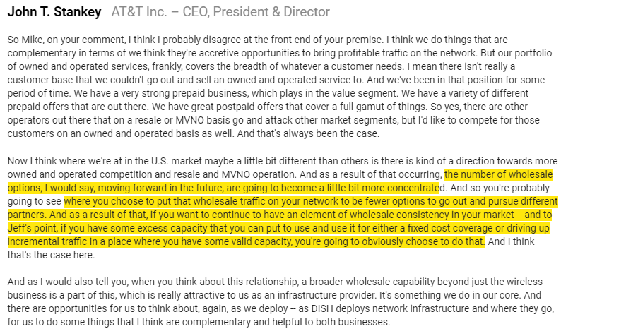 Mobile: CMCSA growth is accelerating and just hit “standalone profitable”. T just won a big MVNO deal with DISH, taking “$500m out of a competitor’s profit”. What do you think of the wireless landscape, both overall and for the cable companies going forward?