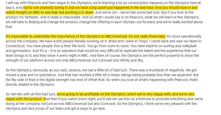 CMCSA + Olympics; as a shareholder, how do you feel about “the importance is not financial” quote?
