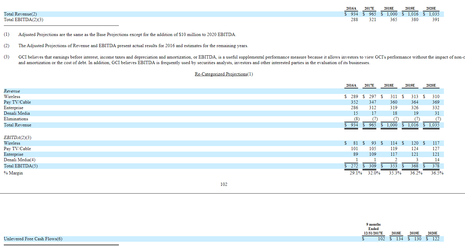 Let’s start with the most obvious new information since my last post: GCI’s projections for their core business on p. 102.
