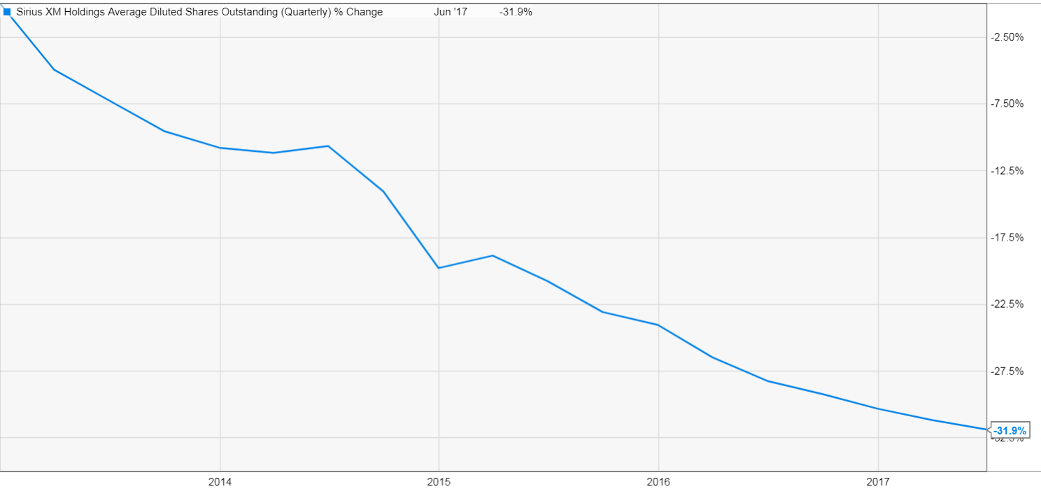 Since Sirius announced their first share repurchase in late 2012, shares have outperformed the S&P 500 while diluted shares have dropped by >30%. CHTR shareholders could do a lot worse than a chart that looks something like the two below!