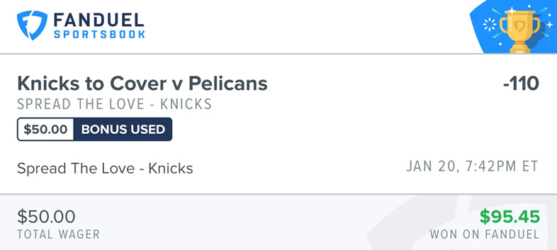 That bet ended up with the Knicks getting a spread of +200 points against my beloved Pelicans. For those who aren’t familiar with how a line / spread works, a spread is how many point you will add to a team’s score to see if they win or lose for betting purposes. So, if the Knicks lost a game 100 - 98 and they were +3, for betting purposes they would have scored 98 + 3 = 101 and won the game 101 - 100. For the “spread the love” bet, the Knicks were getting more than 200 points added to their score. The average NBA team scores ~100 points in a game, and the biggest blow out in NBA history is a 73 point loss. There was literally no way to lose that bet; the only risk was if the game was cancelled for some reason so fan duel would have to refund the bet (fan duel declared the bet a winner sometime early in the first half of the game).