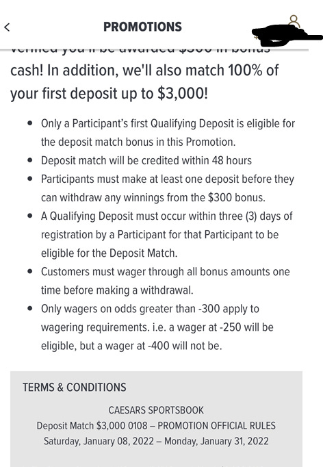 I wanted to dive a little further into point #2: Caesars offer has dramatically changed. Originally, they were doing ~$3.3k in “free money”; you’d get a $300 free bet for depositing money onto them and a $3k deposit match. That offer was way, way more generous than their competitors; I thought their competitors were lighting money on fire but I saw simply no way Caesars was profitably acquiring customers with that match.