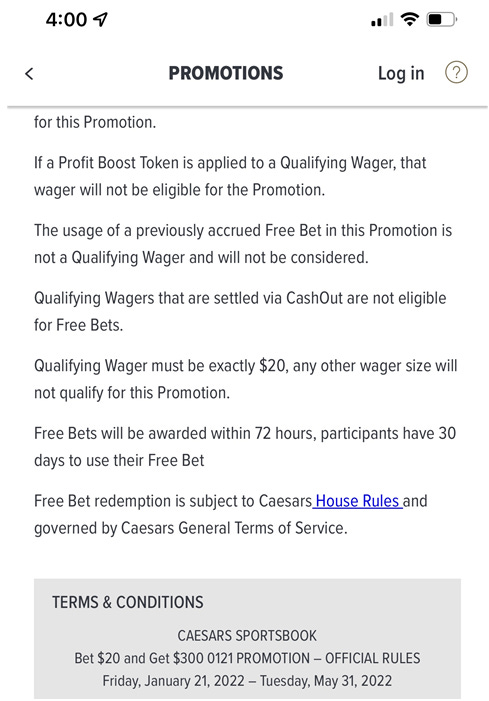 Sure enough, Caesars new offer is dramatically less generous than their old one. I suspect that they realized that their initial offer was equivalent to lighting money on fire as arbs took advantage of their generous terms. Why do I say that? Well, I actually saved the fine print on their initial offer, and it was originally scheduled to run until January 31 (see below; if you’re interested more in the specifics of the original Caesars offer, this site still has some of the fine print up).
