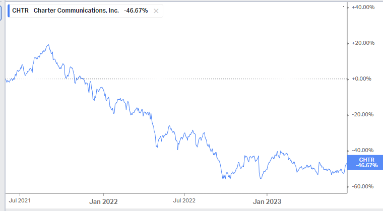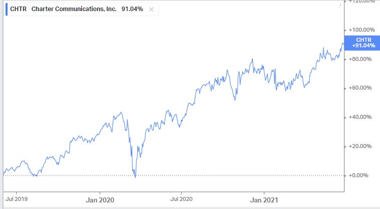 So, from ~mid-2019 to ~mid-2021, broadband demand is exploding thanks to the pandemic, and fiber and fixed wireless roll outs (that bring competition to cable’s markets) still haven’t started on huge scale. In that world, cable stocks rip higher because the market is assigning little to no risk of the monopoly / duopoly breaking.