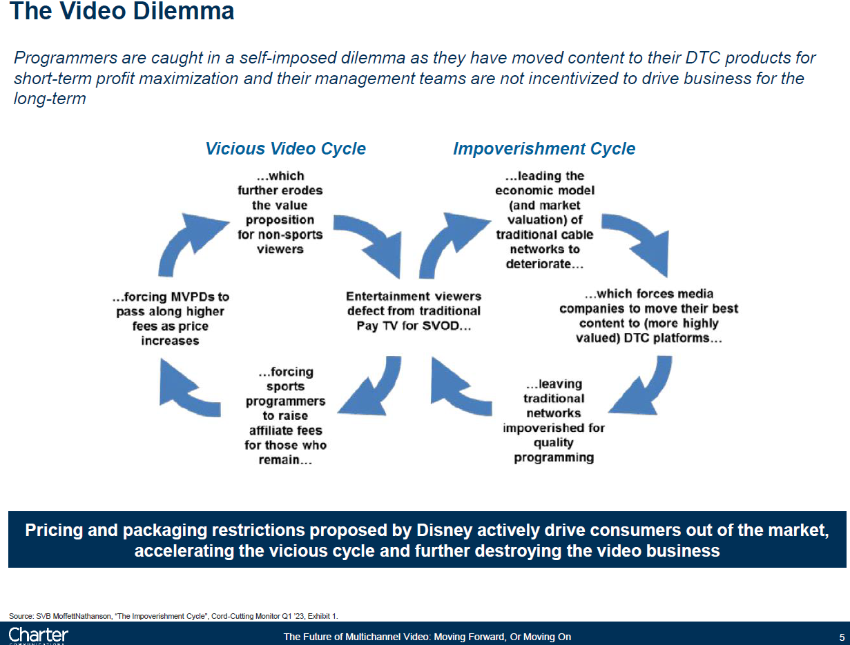 I wonder if that’s changing now. On Friday, Charter announced that they were blacking out Disney and basically threatened that if Disney didn’t come back to the table in the next two weeks, Charter would move on without them. The whole call was fascinating, and I’d certainly encourage you to check out the full call deck. This was kind of the money slide that showed the vicious cycle destroying the cable bundle…