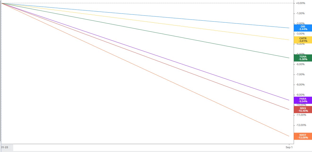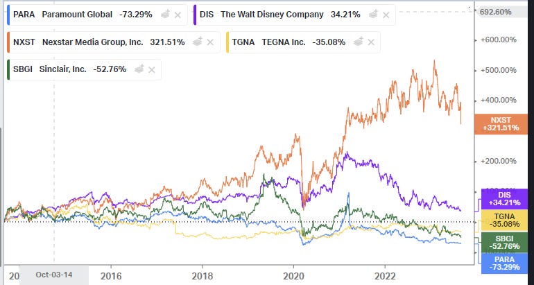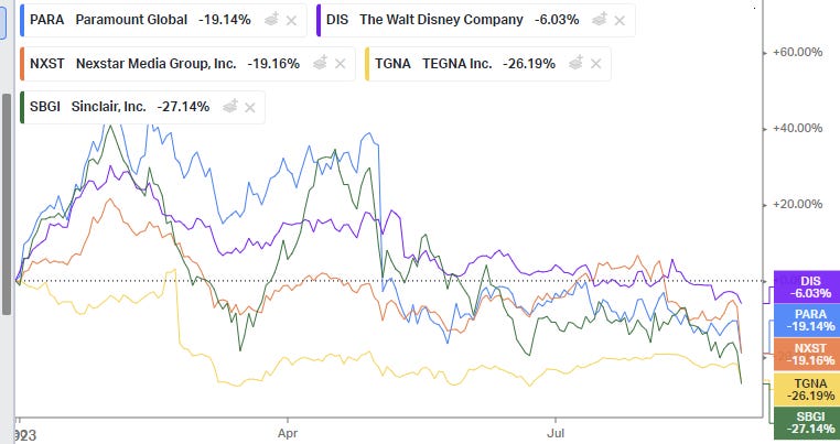 Today, the risk of NXST getting displaced seems higher than ever. It doesn’t take much imagination to draw a line from CHTR blacking out DIS/ESPN to a bunch of distributors blacking out affiliates or forcing them to take huge price decreases to stay in the (diminished) cable bundle. And the market has certainly priced that into their stocks; even before Friday’s sell-off, its been a rough year for most media stocks.