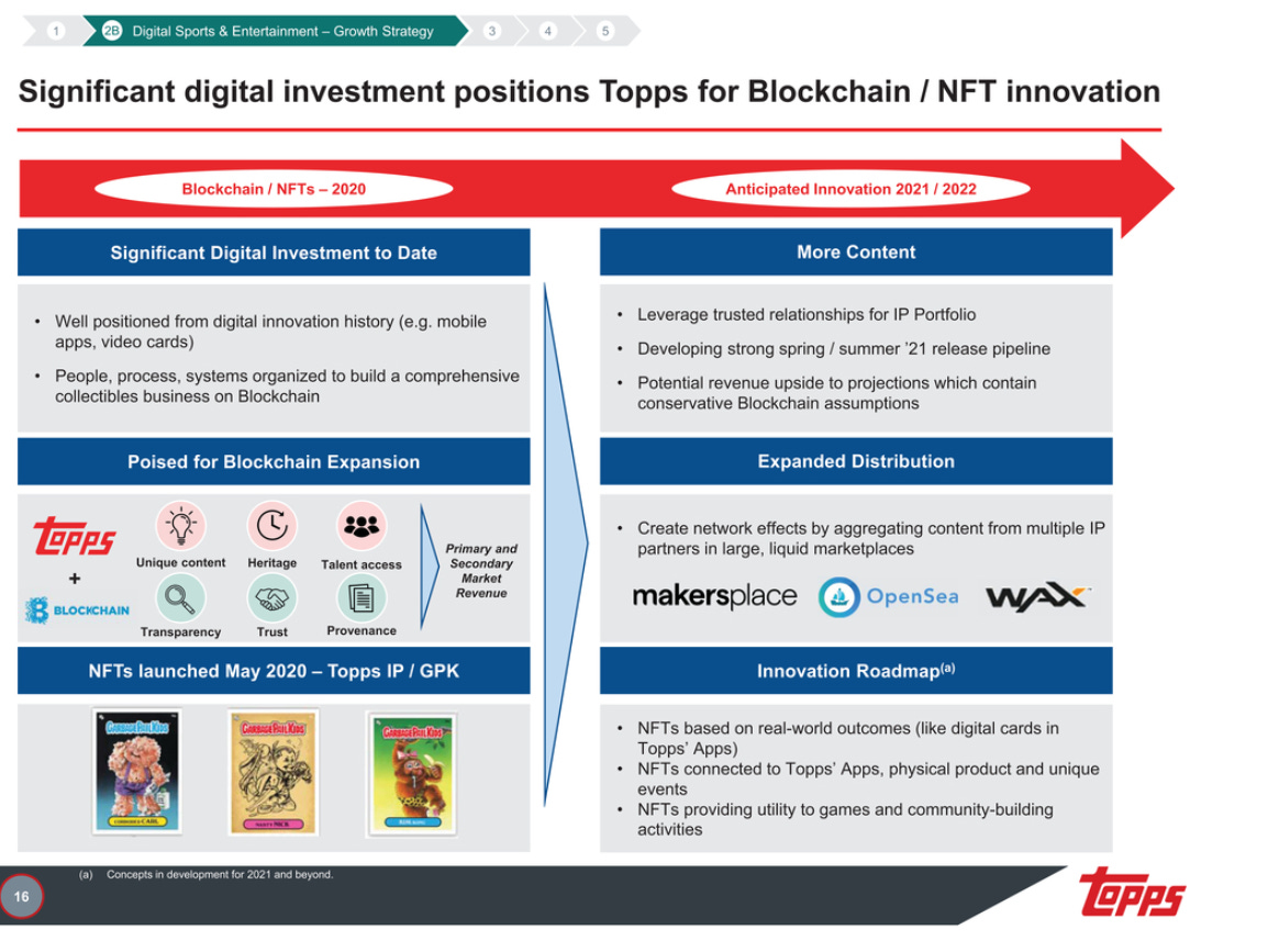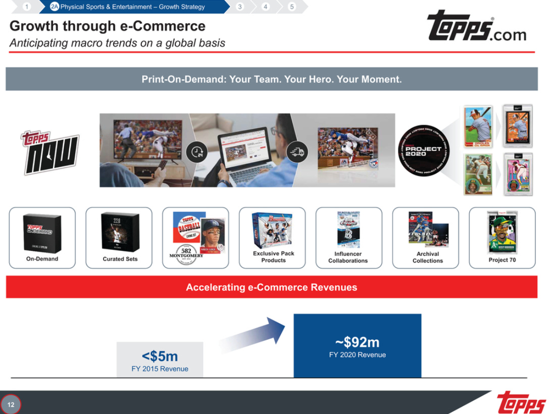 Sticking with the e-commerce trend and moving to the, or the e-commerce theme. You can see here how we've built our e-commerce business. Our idea was while it's great that you can buy product on opening day or it's great that you can go back into the store sometime in the summer or some point in the future and buy additional product. We wanted to reimagine how consumers could interact with our brands and when you think about how important immediacy is to consumers. We had an opportunity to meet that need with technological advancements through our e-commerce business. We started really building this about 5 years ago. We created a brand called Topps Now and this program is depicted in the infantry at top. Let's say you're a fan of baseball watching baseball on the left hand side here and there are several games on a Saturday afternoon. What Topps will do is curate what we believe are the best moments from those games, one moment, two moments, five moments and in the middle image you see that the next day those cards will be available online and they're available on Topps.com for 24 hours. You as a fan have an opportunity to purchase those cards for up to 24 hours after which we shut down the ordering. We produce the cards and they arrive at your door in three to five days. Again, reimagining how products are transmitted to fans and how fans can get engaged in purchasing. That’s evolved all the way to something as recently as project 2020 which was programmed we executed last year with great success it was the year 2020 and we selected some of the best cards that we felt we had delivered over the decades and we turned over the creative licensing- the creative reins to various artists to reimagine and redesign those cards. So whether it's a Cal Ripken card or Tony Gwynn card we entrusted various artists with the opportunity to recreate these cards giving them an opportunity to tap into their social networks their audiences and really expand our audiences and beyond that what's represented in the boxes below are various offerings. I won't go into all of them but it's really just a demonstration of how unique some of these products are and how we bring products beyond our everyday products to consumers via e-commerce.
