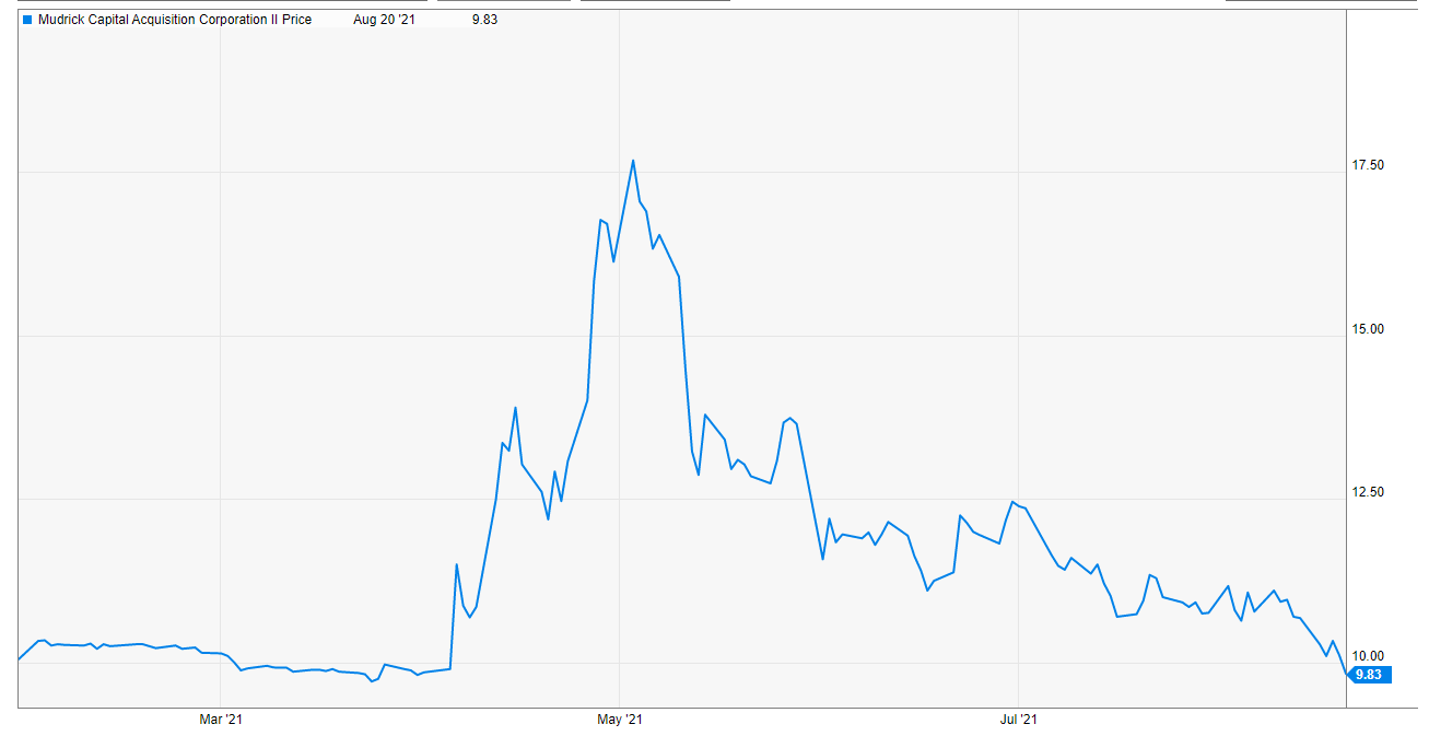 Some background: MUDS announced a deal to merge with Topps, the trading card company, back in April. Now, the wheels had already largely fallen off the SPAC market by April, but the Topps deal proved very popular despite the general cooling of the SPAC markets. Investors instantly saw the potential for Topps to use their iconic IP and rights to take advantage of the booming NFT space, and as the NFT space grew hotter and investors came to understand the TOPPS merger more, the stock continued to rise. At its peak, MUDS was trading for ~$17.50/share, a 75% premium to trust value.