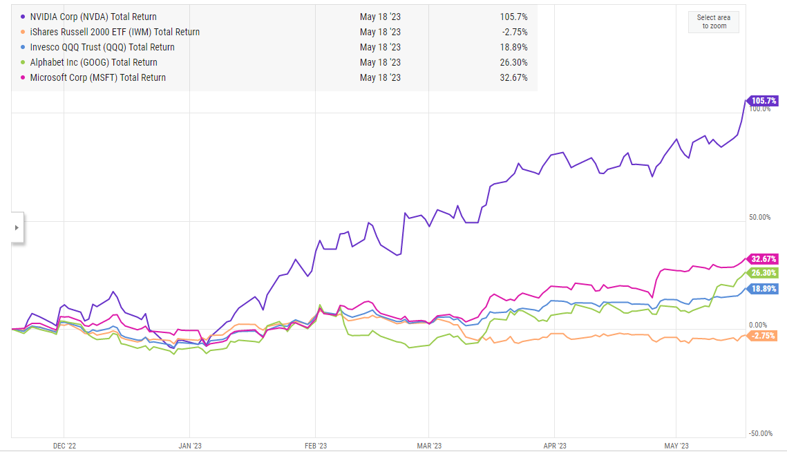Well, not everyone…. but I can assure you that there’s not a single investor who’s watching NVDA rip higher every day (and drag the NASDAQ with it) in the face of a down market (NVDA has more than doubled over the past six months with the Russell dropping a small amount) without thinking “I wouldn’t mind finding something that gets the ‘AI’ treatment.”