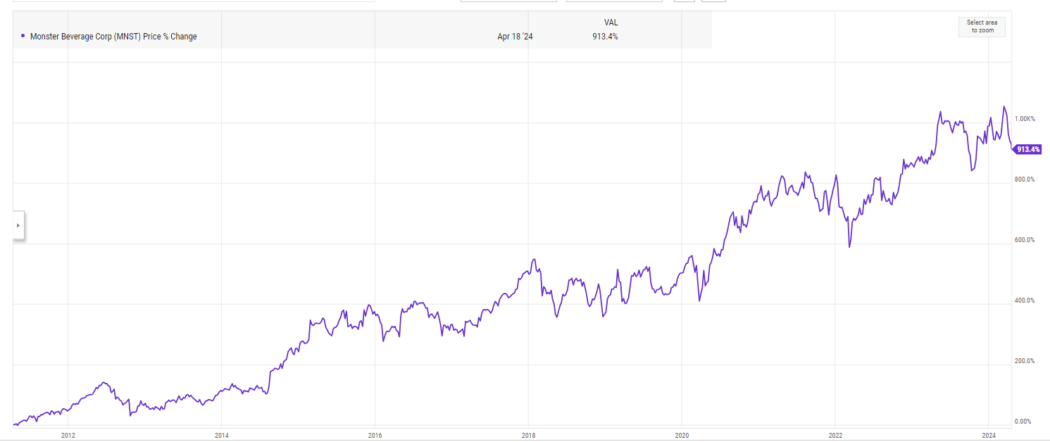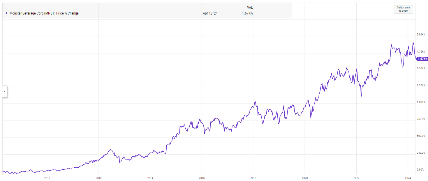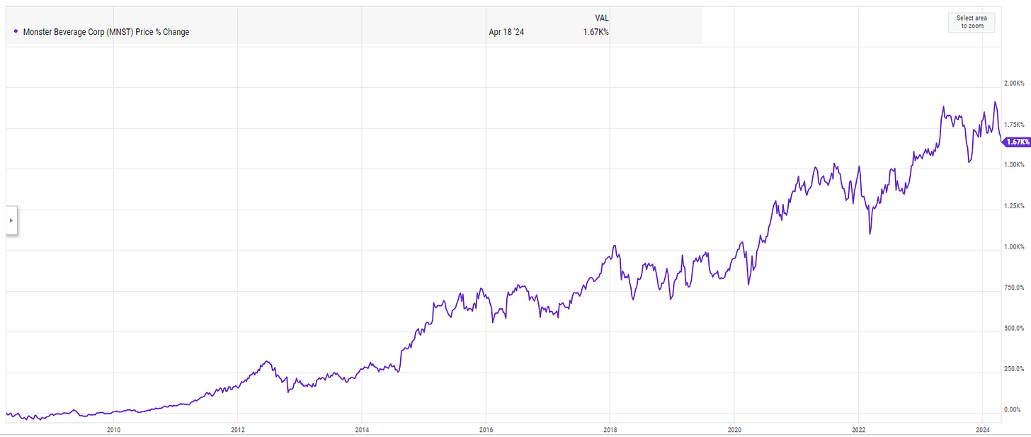 Let me give some background: in ~2011, I was at an event with a friend, and someone very high up from Monster was there (either the CEO or CFO, but I was young and impressionable so maybe it was just a board member. I can’t remember now). I drank a Monster basically every morning before the gym; my friend knew this and went up to the CEO and said I was a huge fan of the product. We talked a bit and I mentioned I was in finance / interested in stocks, and I vividly remember him saying something along the lines of “our stock’s the best performing stock of the best 10 years, and we’re going to do it again over the next 10”. He wasn’t quite right as there are a handful of companies that have outperformed MNST over the past 10+ years, but he was directionally spot on and the stock has been an absolute screamer since: