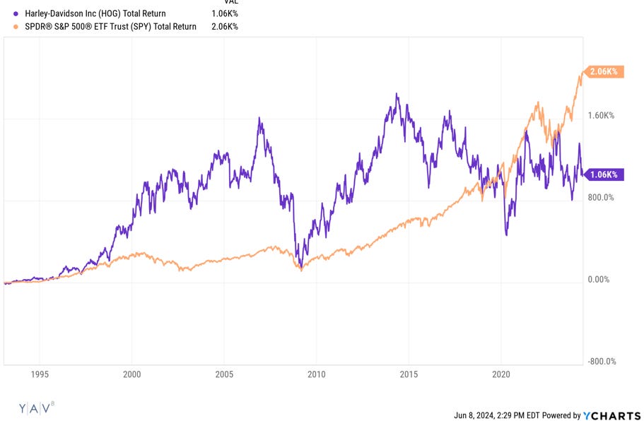 A few years back, there was a popular adage that was something like “buy companies where the brand is so good people turn it into a tattoo.” If we use “people get it as a tattoo” as a benchmark for brand love, it’s hard for me to think of a single example of widespread tattoo usage that has failed on the long run as a stock investment (widespread is important; I wouldn’t qualify Galaxy Digital’s Luna tattoo for this exercise!). The worst I can think of is Harley Davidson (HOG), which crushed the market for years but lost their mojo during the financial crisis and have been huge underperformers since they mid-2010s: