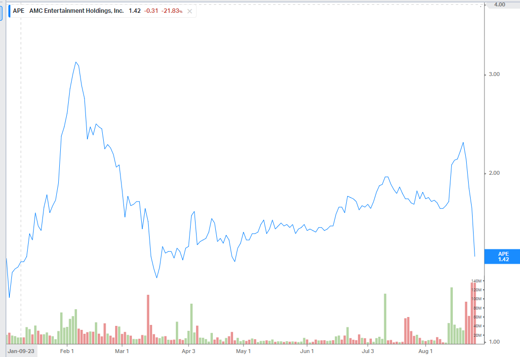Instead, AMC has just screamed lower. Aside from some very brief periods in early January, APE never traded below ~$1.00/share. At AMC’s closing price Friday of ~$8.50/share (remember, they did a 1 for 10 reverse split, so $12.50 is equivalent to $1.25 pre split), AMC is currently trading below where APE traded for basically all of this year. In fact, AMC’s currently trading below where APE traded for almost all its existence.