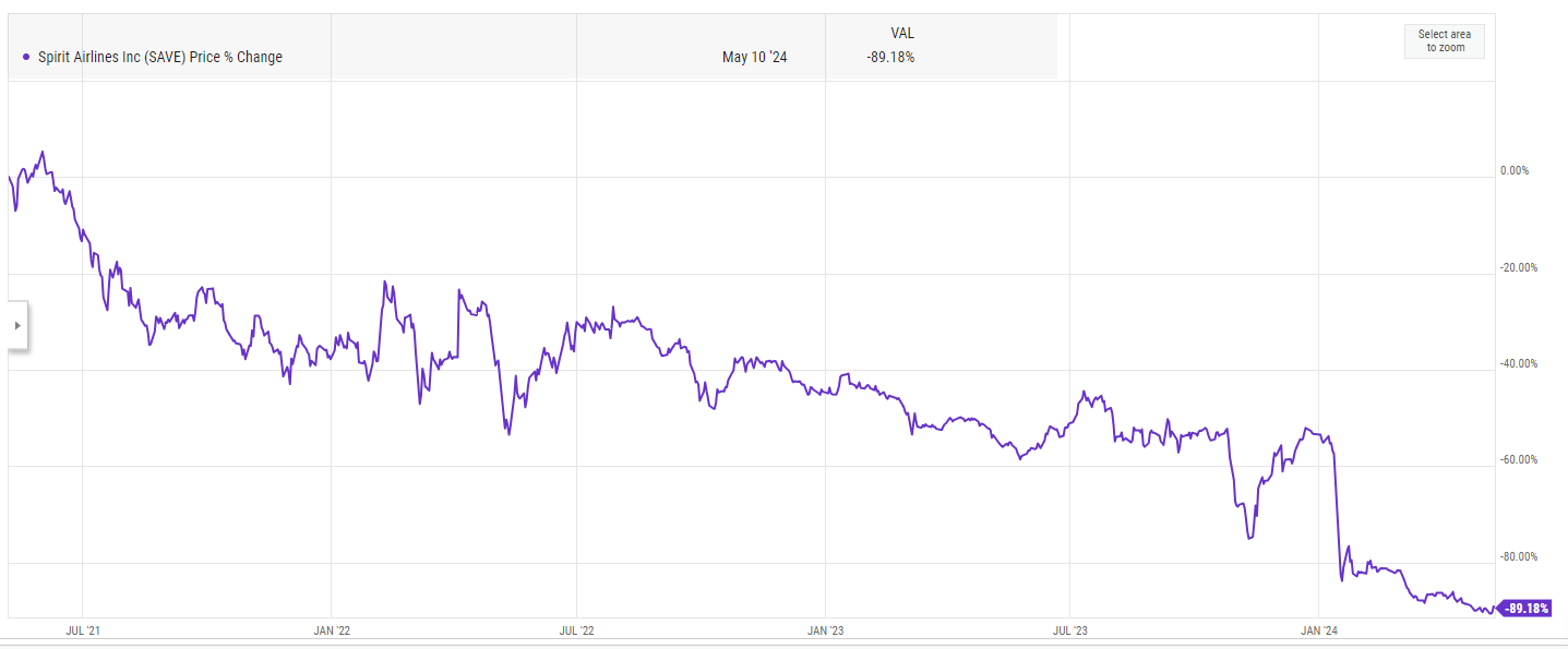 CPRI’s downside blowing out continues a recent trend we’ve seen where antitrust challenges a deal, and the downside turns out to be way lower than the previous standalone price. Both SAVE and IRBT got challenged (and blocked) by regulators, and both are now on the verge of distress / bankruptcy. SAVE is a particularly interesting case; the stock was trading for ~$20/share in early 2022 before they had a freaking bidding war between ULCC and JBLU (with JBLU winning with a price >$30/share, including the dividend); today, the stock is <$4. Just look at the stock chart below; I know the stock is not the business and things can change over time, but isn’t it crazy to look at the stock plummeting and think “over this time, Spirit was the subject of a fierce bidding war and an antitrust effort that argued they were so uniquely successful in lowering prices for consumers that no reasonable regulator would allow any competitor to buy them?”