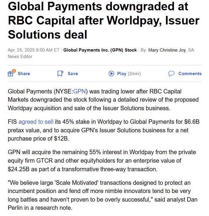 Speaking of bad M&A, let me turn to another fun one: Global Payments (GPN). Last month, GPN announced a deal to buy World Pay and divest their Issuer Solutions business. The market response has… not been kind; the stock has underperformed the index ~20% since the announcement and the deal triggered a slew of downgrades: