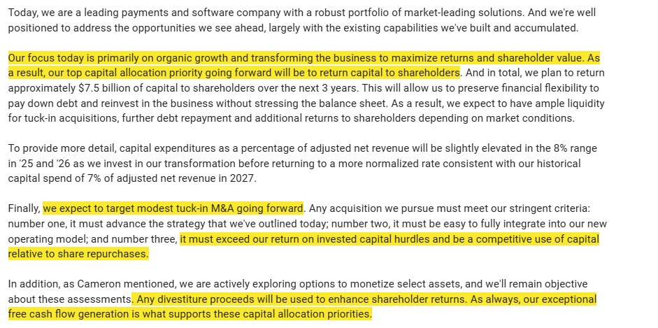 Why do I mention this deal? Well, GPN had just had an analyst / investor day back in September, and it’s really interesting to review what they were saying then. In particular, it’s hard to marry a focus on “modest tuck-in M&A”, “organic growth,” and “our top capital allocation priority going forward will be to return capital to shareholders” with GPN’s decision to pursue a strategic deal that paused shareholder returns and sent the stock down 20%!