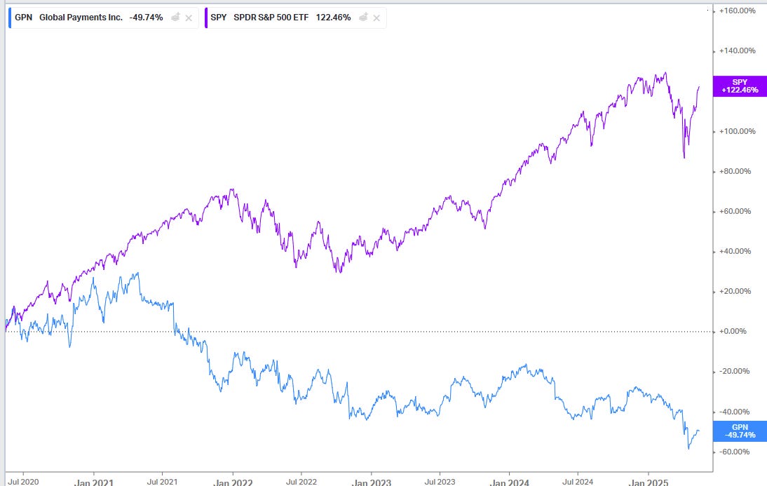 GPN’s stock has been a perennial underperformer. The current CEO took the job ~2 years ago, but he’s had C-level positions at GPN since ~2012, and GPN’s Chairman was appointed >5 years ago, so I think it’s fair to lay most of the medium to long term performance of GPN at their feet. If you held the stock over the past five years, you’ve massively underperformed, and the cherry on top is management just did a deal they promised they wouldn’t do and tanked the stock 20%.