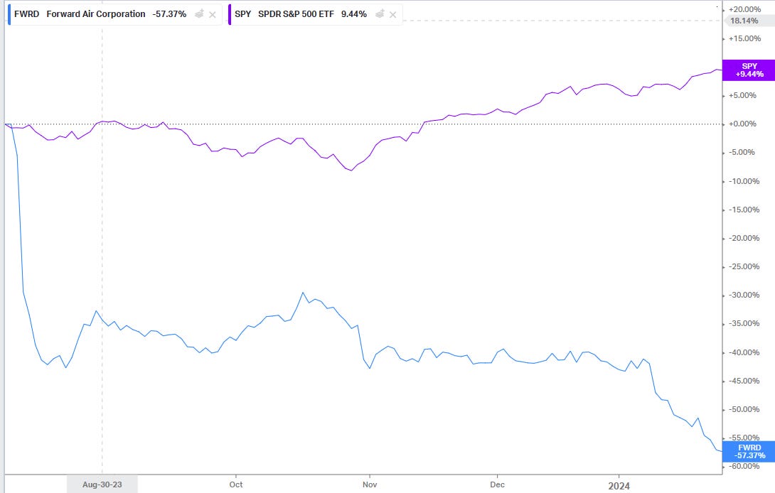 Let me start with my personal favorite example: Forward Air (FWRD). FWRD is well known in event circles, so I won’t rehash too many details, but the basic set up is that Forward announced a deal to buy Omni Logistics in 2023. To say the deal was poorly received would be an understatement; Forward’s stock dropped by >50% between deal announcement and deal close (in an up market!).