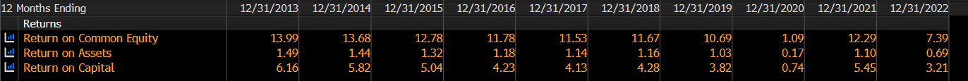 Speaking of “consistently do mid-teens ROEs over a long period of time”, it’s interesting to look at WFC’s ROEs over the most recent decade; suddenly, instead of mid to high teens, WFC is hitting the low teens and then approaching 10% flat (and this is before COVID, so in a pretty good economy and after corporate tax rates got lowered!).