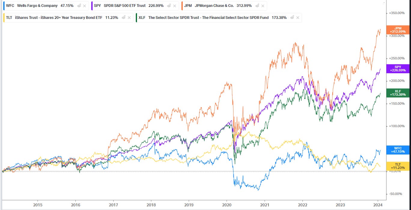But, in the 10 years since, Wells Fargo has performed abysmally. The stock has badly lagged both the indices and financials; in fact, the stock has barely outperformed treasuries (and we were living in a zero interest rate world, so treasuries weren’t exactly a high bar!). Peer JPMorgan beat the indices nicely over the same time period; what’s crazy is that with the benefit of hindsight it’s tough to understand why Wells would underperform so badly. This is a bit of an oversimplification, but the past ten years have increasingly favored larger banks given their implicit government backstop and huge benefits to scale (leveraging tech and regulatory costs) that simply didn’t exist 20-30 years ago. Given that backdrop and the assets they started with, it’s honestly hard to understand how Wells could fumble the past decade so badly