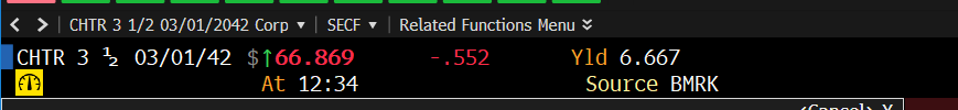 The answer, of course, is that those are super long dated bonds issued in a different interest rate environment (they pay 3.5% interest and mature in 2042!). The 20 year treasury currently yields ~4.5%; those CHTR bonds are roughly the same duration and yield ~6.667% to maturity. Now, a >2% yield over treasuries is nothing to sneeze at…. but unless you’re running a fixed income mandate, I’d guess that spread isn’t really worth the illiquidity, risk, trading costs, need to monitor the credit, etc.