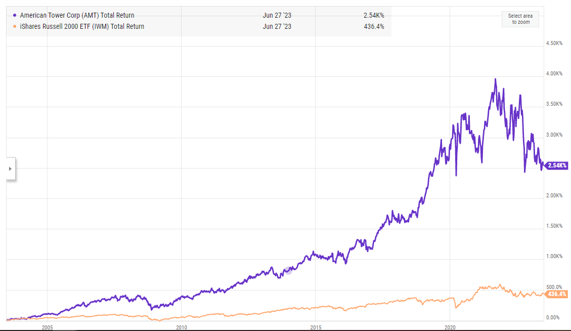 Last week, a friend suggested I should look at the African tower companies. There’s a lot to the pitch behind African tower companies, but if I had to boil it down to one thing it would be this: African tower companies today are roughly in the same spot American tower companies were in ~20 years ago, and if you had bought American tower companies 20 years ago you would be a very happy investor. Consider the 20 year chart of one American tower company (ironically, American Tower Company (AMT)) versus the index: