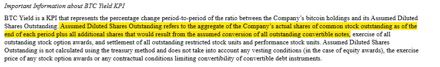 But, if you look at the fine print, BTC yield is even crazier than simply suggesting increasing BTC per share is the only value creation metric that matters. If you really look at the MSTR BTC yield table above or read their disclosures, you’ll notice that the BTC yield assumes that all of their convertible debt converts.