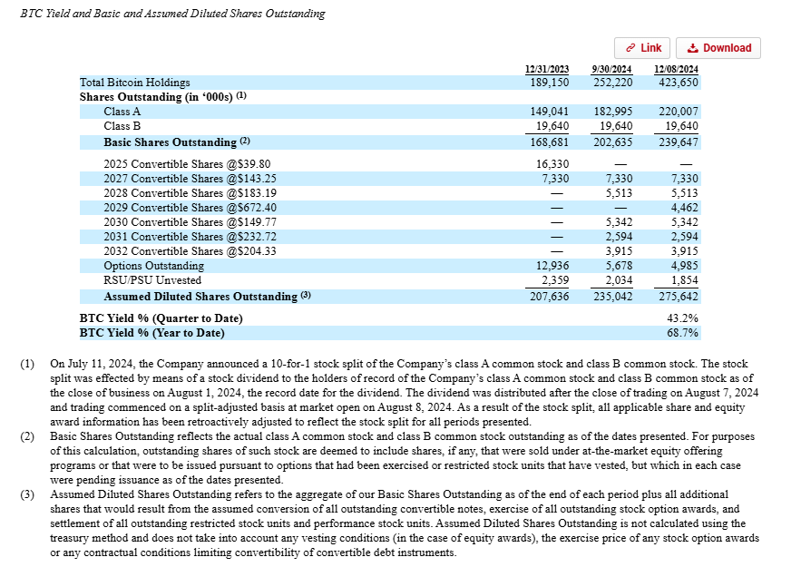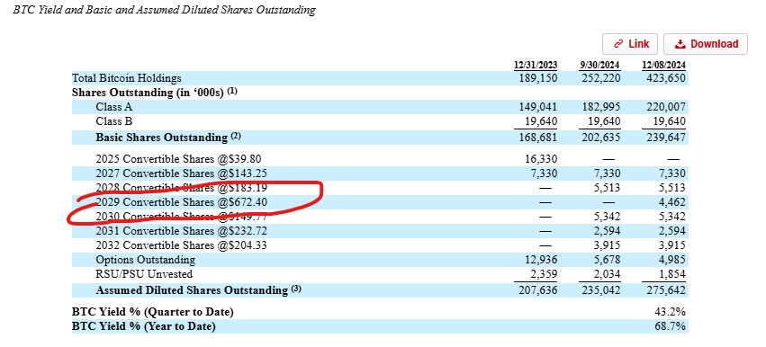 So, go back to MSTR’s BTC yield table; they have a set of 2029 converts that convert at $672.40/share. Those are far, far out of the money (MSTR’s stock trades for ~$400/share as I write this)…. yet MSTR’s BTC yield assumes those converts are in the money / will convert for their BTC yield.