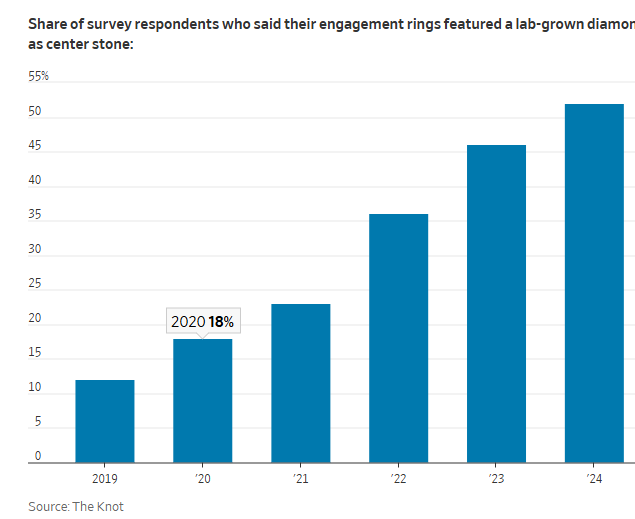 Lab-grown diamonds might break that concept. This WSJ article is filled with all sorts of interesting stuff on lab versus natural diamonds but this chart showing the number of people with a lab-grown engagement ring ~5x’ing over 5 years is probably the money shot; it’s hard to imagine a world where people are completely comfortable switching to lab grown diamonds yet diamonds somehow still retain a “store-of-value” property.
