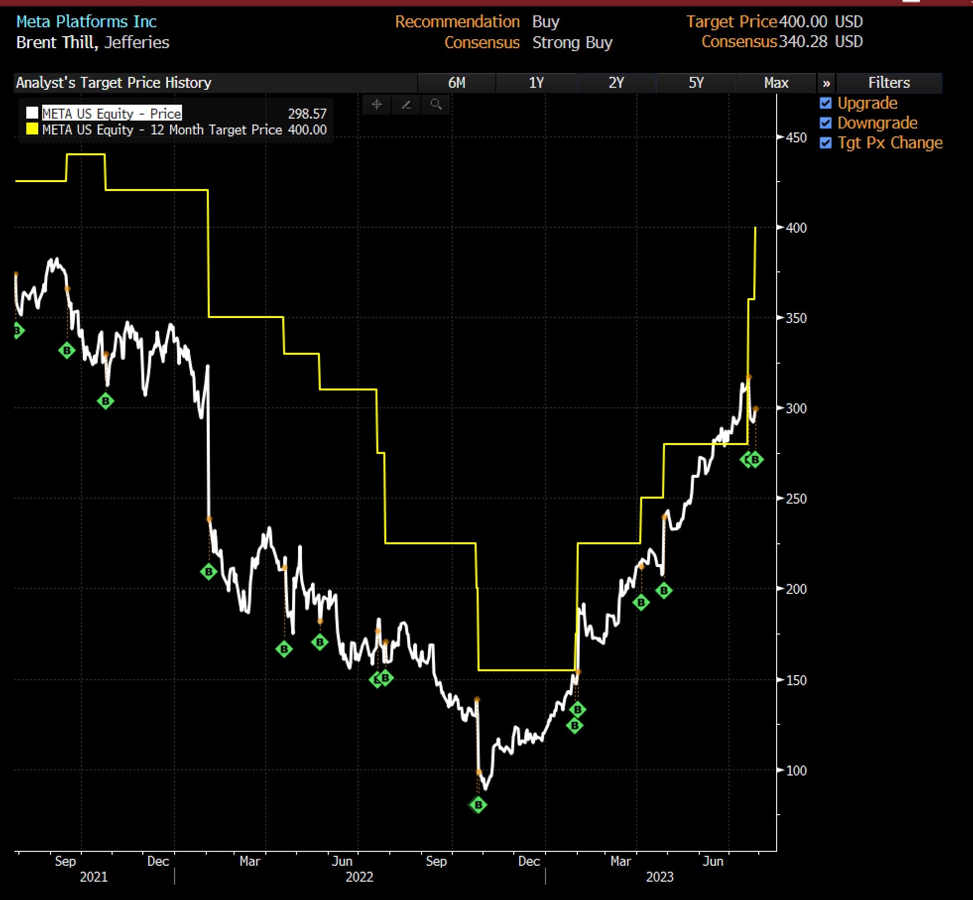 However, there are other investors who are spiking the football on the big rise in Meta. I’ve coined them in my heads “the double downers”. They had a large position in Facebook in late 2021 (when the stock was over $300) on the thesis “Zuck can do no wrong / Metaverse domination”. They doubled down when the stock hit $250, then again at $175, then again at $100. Now, the stock has round tripped all the way back to where they held it a few years ago, but they have an enormous win because they doubled down constantly. It’s not apples to oranges, but I think of these investors as kind of epitomized by the recommendation and price target of the Jefferies’ META analyst: