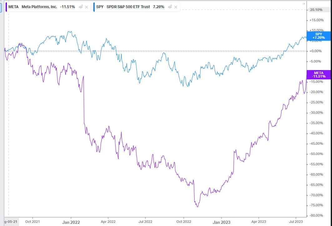 Anyway, the thesis for owning Meta at $300 two years ago and $100 a few months ago were diametrically opposed. At $300, you were really thinking about Facebook’s growth opportunities and new markets. At $100, you were betting Zuck wouldn’t light the company on fire. And it’s probably worth noting that if you bought META two years ago, you’d be substantially underperforming the market even after META’s big run. Yes, you could have improved on that by adding all the way down…. but again, that was a big risk!