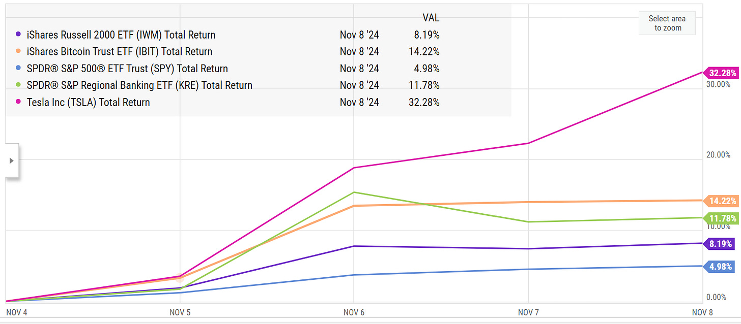 I will be honest: if you weren’t long whatever theme you wanted to play heading into the close Tuesday, I suspect the market had already adjusted for it by Wednesday morning. For example, it’s pretty consensus that Trump is going to be good for regional banks…. and that consensus is reflected in the regional bank index up ~10% over the pats five days and 15% in a month. That’s not to say you can’t generate alpha buying regional banks, but if you are you’re making a bet that Trump will be more bullish for the market / regional banks than is already priced in. You can make similar arguments for crypto plays or twenty other industries.