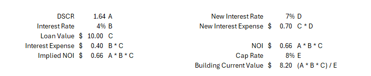 Here’s some quick math. Just assume that you have a building with a $10m loan outstanding that was done at a fixed 4% interest rate a few years ago. That implied ~$400k in annual interest expense and ~$660k in annual NOI (using the DSCR numbers from that chart). If we assume interest rates on mortgages today are 7%, then the building would be cash flow negative on current interest rates / once the rate resets ($700k in interest expense versus $660k in NOI).