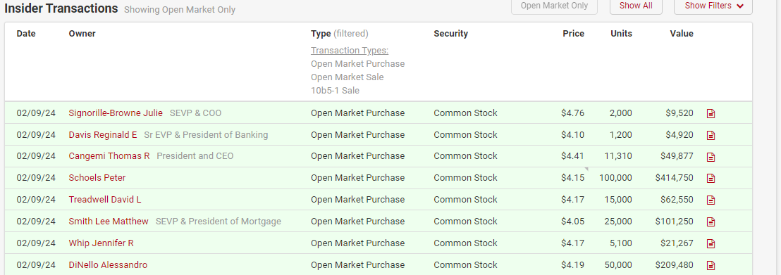 Speaking of preventing a run, there was a wave of insider buying on Friday. That’s standard for any bank crisis; even if it’s just a token amount, insiders buying shows faith in the underlying institution and that it won’t just evaporate / that there aren’t discussions going on for an FDIC takeover*. What I thought was really interesting was how tuned into the “buy shares on the open market to build confidence” playbook NYCB was; given the update call was on Wednesday (Feb. 7th), I’m guessing the whole company was blacked out from trading on Thursday (February 8th), meaning the window for insider buying opened up Friday (February 9th). Insiders did not waste a second of that window being open; they instantly bought the stock and started filing form 4s intra-day.