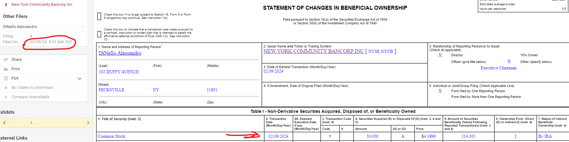 Nothing wrong with that strategy: a panic is a funny thing, and it’s better to pull out all the stops to prevent the bleeding upfront versus let things spiral out of control. I guess NYCB knew that getting their form 4s filed instantly on Friday versus later in the day (or, heaven forbid, after the weekend) would go a long ways towards stabilizing the stock price (which can be self reflective on the company and depositors; financial companies are the one breed of company where a low stock price can actually tank the business if unaddressed). And the strategy seems to have worked: NYCB closed the day up ~17% and seemed to go up a bit every time a new form 4 hit.