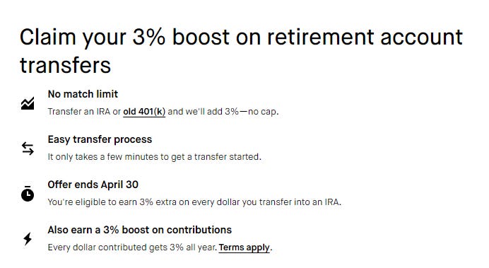 It’s not like trying to get customers to transfer retirement accounts (or brokerage accounts) is a new thing. As far as I can tell, Robinhood is the only broker that’s offering a match bonus for rolling assets (ok, that’s not quite true; WeBull is offering a 3.5% match, but I know nothing about them so I’m going to ignore them). I’m sure eTrade, Fidelity, etc. would all love to custody your IRA assets….. but as far as I can tell none of them offer any match money to encourage you to bring money over. What is Robinhood seeing in their stats that suggests a pretty hefty amount of matching money is worth it when none of their peers appear to believe that?