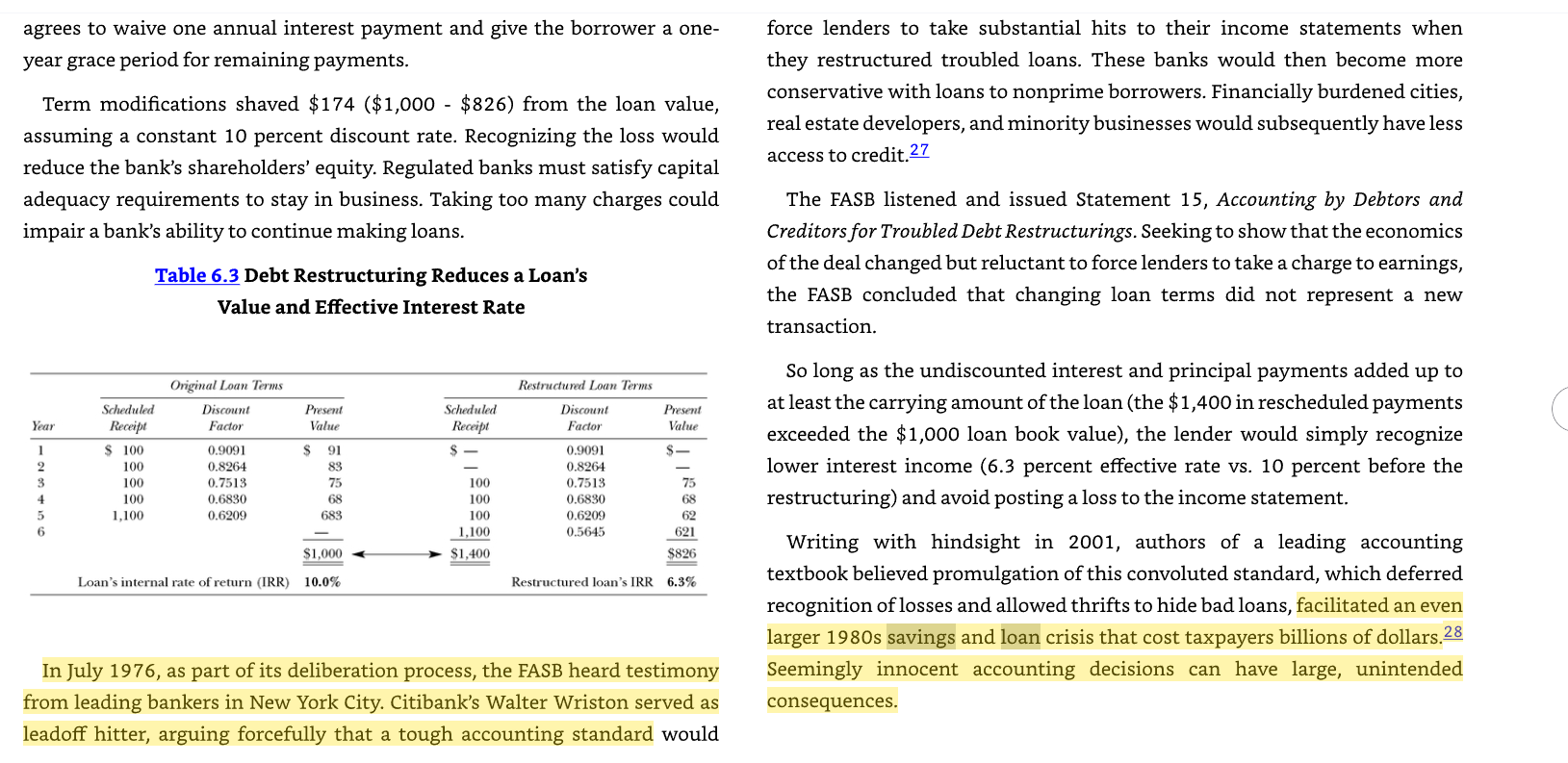 Perhaps my favorite example in the book comes in chapter 6 (and again chapter 9), when financial institutions lobby FASB to let them report loans at par even if they have credit issues…. which paves the way for the 1980s savings and loans crisis. I love that example so much because it rhymes so well with the “held to maturity” SIVB / First Republic blow ups.