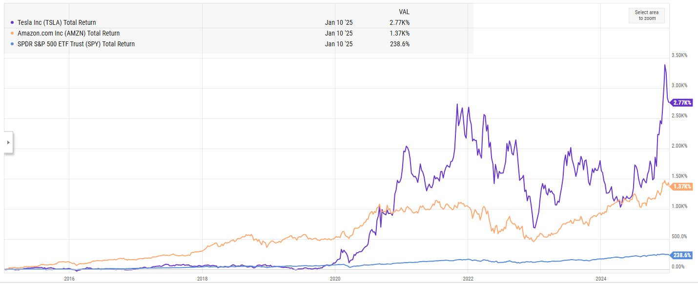 Let me give you an example that I think fits nicely. In the mid-2010s, David Einhorn somewhat famously had his “bubble basket” of shorts. The headliner of these shorts were Tesla and Amazon, but he had a few others in there (note: I generally like Einhorn, so I chose Einhorn not to pick on him specifically but because he’s a high profile example with CNBC articles detailing his Bubble Basket; there were plenty of other investors who had similar thesis but weren’t featured on CNBC so I can’t use them as an example!). The basic thesis behind the “bubble basket” is that while Tesla and Amazon might be great companies with great products, the economics of their businesses were terribly flawed as they reported very little (if any) profits, and history suggested the companies would fail to grow into their sky-high multiples…. and as the stocks continued to perform well through the 2010s, I remember more and more calls that compared the market then to the dotcom bubble.