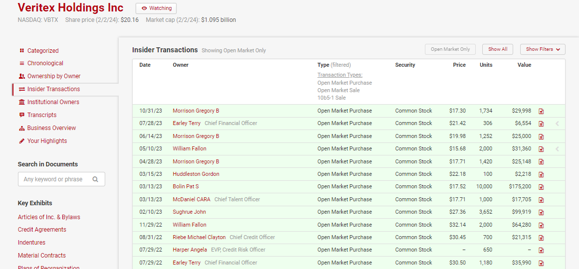 Or, if you want to avoid integration in banks, here’s a pretty vanilla one (at least from my quick review): Veritex (VBTX) did ~14% ROTE last year and trades at almost exactly book value. You could underwrite some pretty strong returns over the next few years buying them without assuming any multiple expansion (though a bank doing a low to mid-teens ROE really should trade for a bit of a premium to book!) or needing to worry about the asset issues at NYCB. Insiders appear to agree; it’s nothing crazy but there’s been a decent bit of buying at VBTX over the past two years: