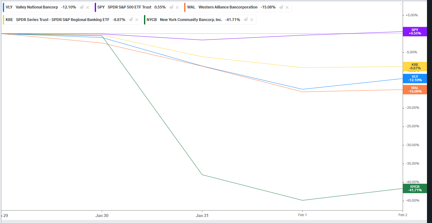It is entirely possible we’re about to see an awful CRE cycle…. but what’s so interesting to me is that NYCB is one of the last banks to report, so we’ve already seen the types of loans and marks that other banks are taking! For example, both VLY and WAL reported Q4 results on January 25 (i.e. before NYCB reported). I’d expect banks in general would get murdered if one of the first banks to report earnings reported surprise write-offs / asset issues, as investors would (rightfully) start “shooting” banks that hadn’t reported on fears that the asset deterioration was broad based, not idiosyncratic. But, in this case, the peer banks had already reported earnings / discussed the trends in their loan book; investors had a full week to digest those and properly value the banks …. and then NYCB reported one or two bad loans and investors completely changed how they looked at the other banks loan marks / earnings. That seems strange and honestly wrong / an overreaction to me.