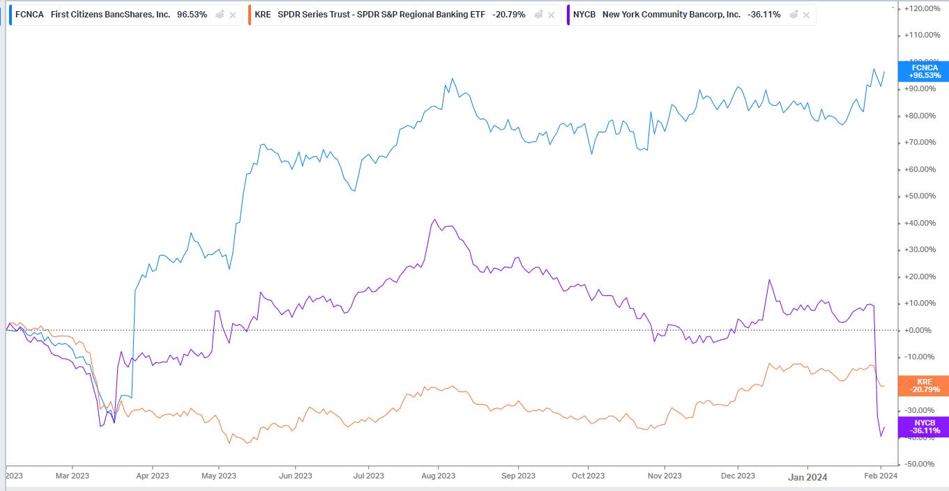 It’s just so crazy how much things can change in a year. FCNCA’s deal is one of the best deals in history; the stock has almost doubled over the past year. In contrast,NYCB’s dream deal has turned into a nightmare: the bank has actually underperformed the index significantly over the past year, and a lot of the issues NYCB is having today can be traced back to the Signature deal (but certainly not all of the issues! Astute banking analysts have suggested NYCB had some skeletons in their lending closet for years, but the Signature deal and resulting scrutiny appears to have accelerated some of them).