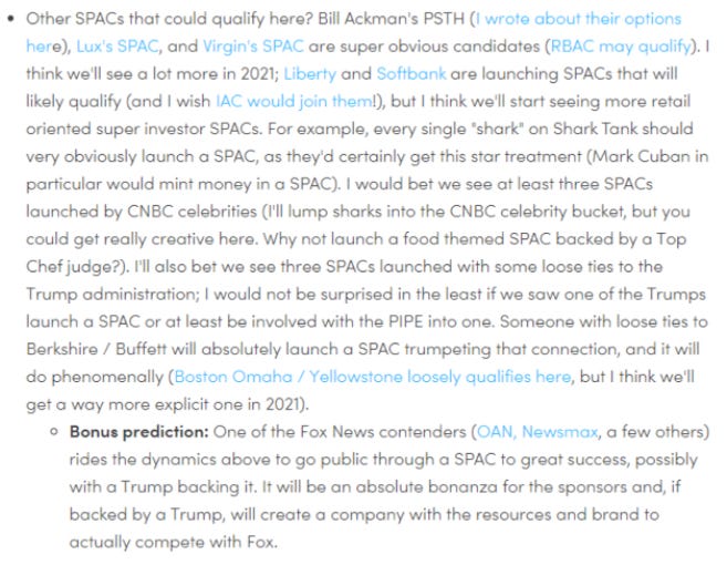 #2: I am going to take a mini victory lap and note that one of my predictions for 2021 was a Trump SPAC.