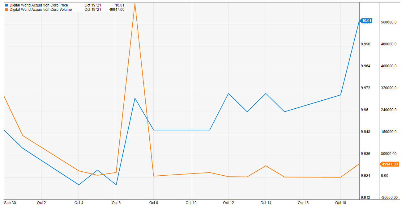 #1: The chart below shows DWAC’s volume for the ~month before Trump deal announcement (blue line stock price, orange line volume). Look at that big price and volume spike in early October. If I was the SEC, I’d be very interested in learning who made that trade and what they knew when they did it.