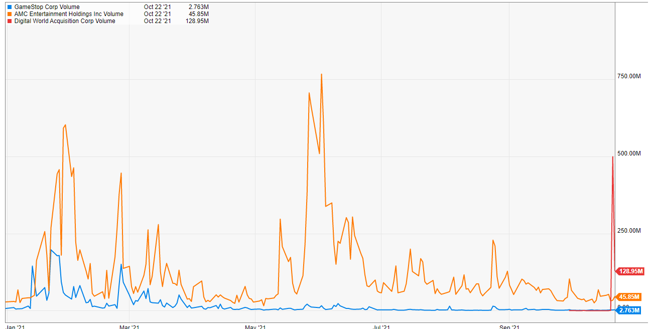 I tweeted this out day of, but DWAC traded just shy of 500m shares on Thursday (the day the deal was announced); that’s an insane amount. At its peak, GME never traded more than 200m shares in a single day. AMC appears to have broken 500m shares a few times this year, but the DWAC volume is still incredible and, while DWAC probably won’t approach Thursday’s lofty levels again, I’d suspect the stock remains incredibly volatile (and very heavily traded) as Trump is nothing if not a marketer and he will be sure to keep DWAC and TMTG at the front of the news as often as he can (plus, I believe DWAC options start trading Monday, which will likely add fuel to the fire!).