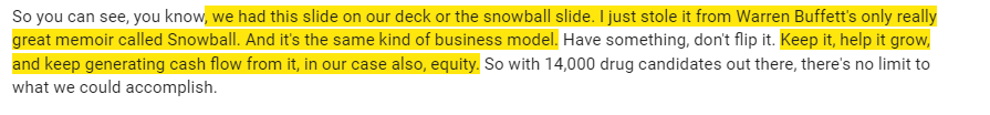 I’ll pause here to note I haven’t done wild amounts of work on FBIO. It’s entirely possible they got really unlucky in the past (i.e. an unexpected failure on a key drug), or their snowball is just set to really get rolling (it’s a microcap! It’s not unheard of for these to be wildly undervalued before some massive good news comes out; SGTX just got acquired for a ~650% premium!). I honestly only chose FBIO because I did a transcript search for Buffett and just couldn’t resist the combination of talking about Buffett’s snowball while having an active At-the-Market program.