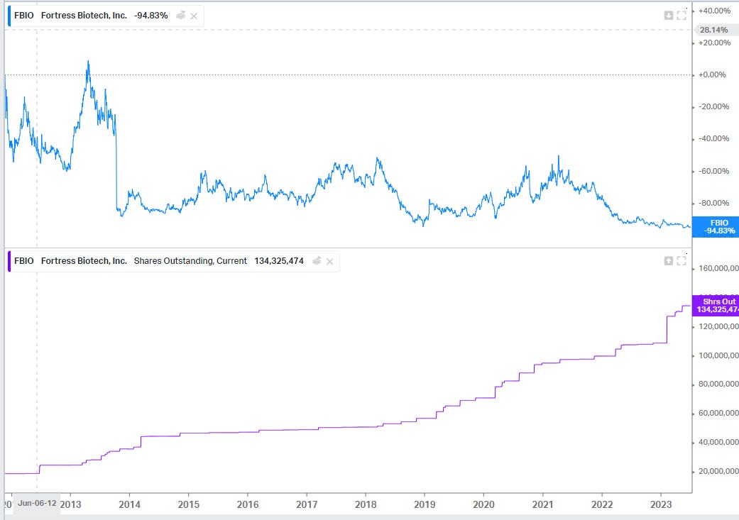But, in practice, I’d suggest FBIO’s execution has been just a little bit off. The whole point of the snowball is to maximize shareholder value per share. You generally do this by increasing intrinsic value while shrinking the share count; a cynic could argue FBIO has been running a “reverse snowball” by maximizing their share count while decreasing the share price.