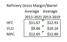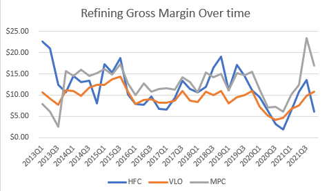 Each refiner has a bunch of different complexities (the complexities of the refinery, if they can source oil cheaper than market prices, etc), so there’s no one number than fits all companies…. but you’re probably safe to use a low double digit crack for most refining companies. For example, if you just use the Daloopa data from the chart for the three companies above, you’d see they average $10-$12/barrel in margin from 2013-2021. If you stripped out 2020 and 2021 (those were pretty unique years), the margins would be a bit higher.