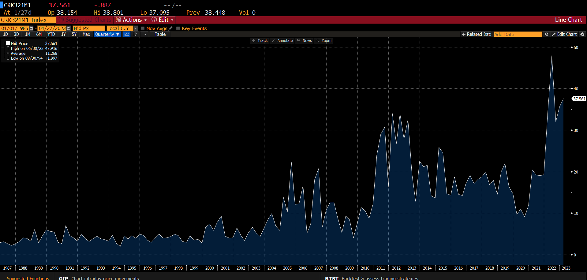 One point to add is that it is very difficult to build a refinery in America, so adding capacity to address high crack spreads is not going to happen. Given the capacity constraints, there is a risk of supply shocks which add to the risk premium.